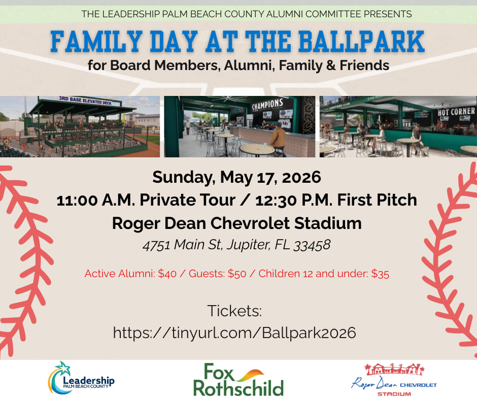 Step up to the plate for a fun-filled afternoon with your Leadership PBC family at the ballpark as we watch the Palm Beach Cardinals vs the Daytona Tortugas! We’ll be watching the game from the brand-new Jupiter Medical Center Champions Club, enjoying premium seating and an all-inclusive experience. Your ticket includes: Access to the exclusive JMC Champions Club, All-inclusive gameday menu, and Unlimited water & non-alcoholic beverages. As an added bonus, a private 45-minute tour of the new stadium facilities will be given before the first pitch! Bring your family, connect with fellow alumni and friends, and enjoy America’s favorite pastime in style.