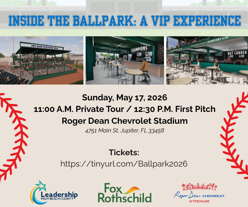 Exclusive Private Stadium Tour: Enjoy a 45-minute private tour of the newly opened ballpark and training facilities. As one of the first groups to access these spaces, Leadership PBC participants will get a rare behind-the-scenes look at the new stadium.